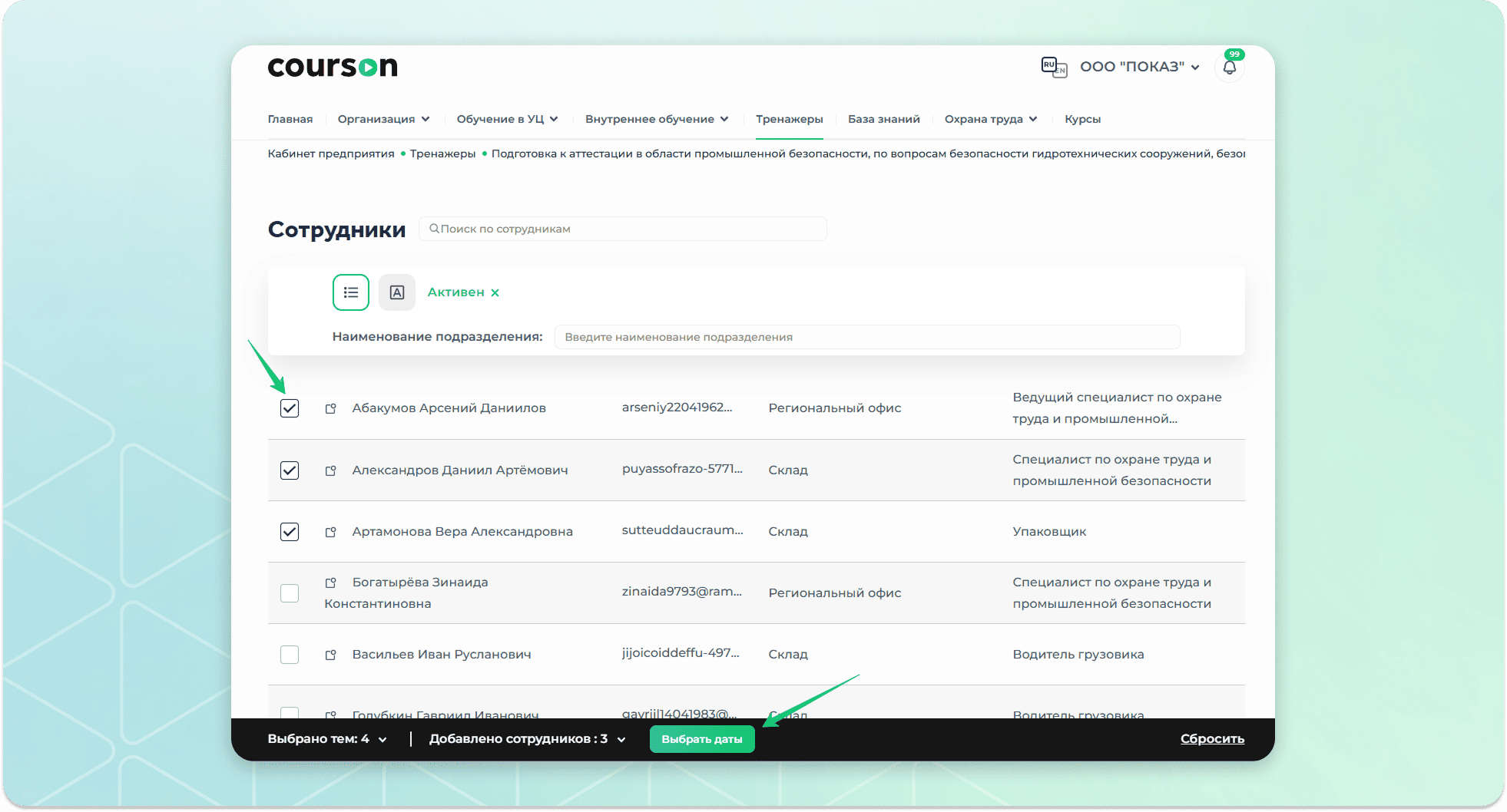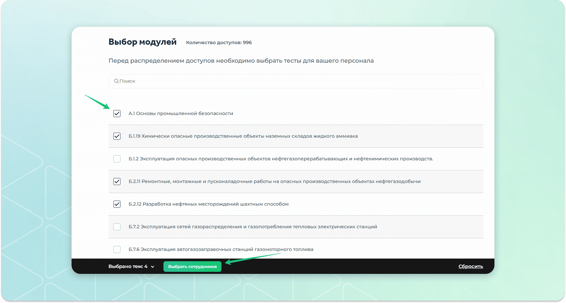 Выбрать нужные модули и нажать на кнопку "Выбрать сотрудников".