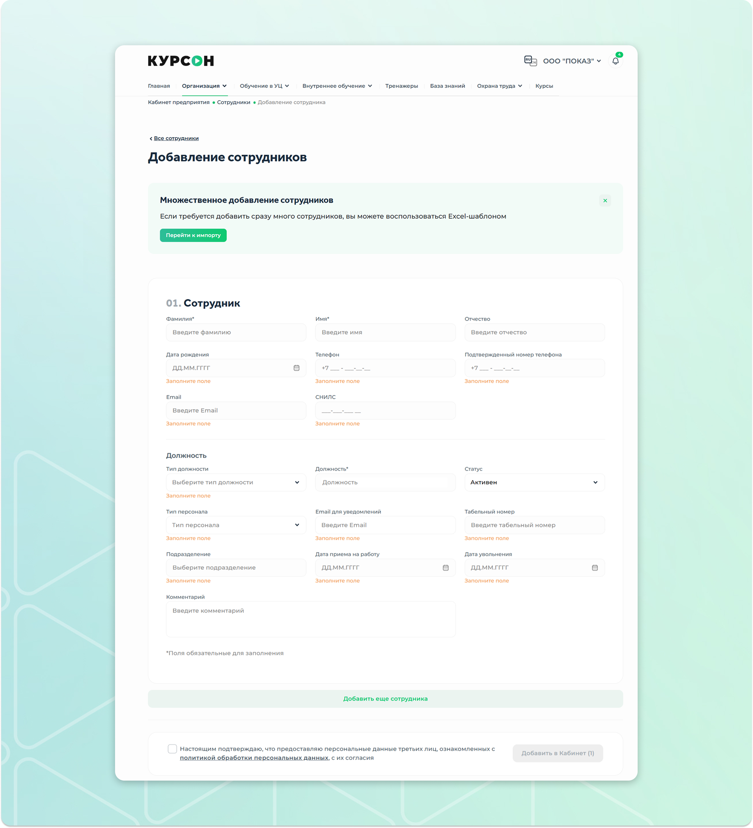 Обязательными полями являются: "Фамилия", "Имя", "Должность", но мы рекомендуем заполнять все поля.