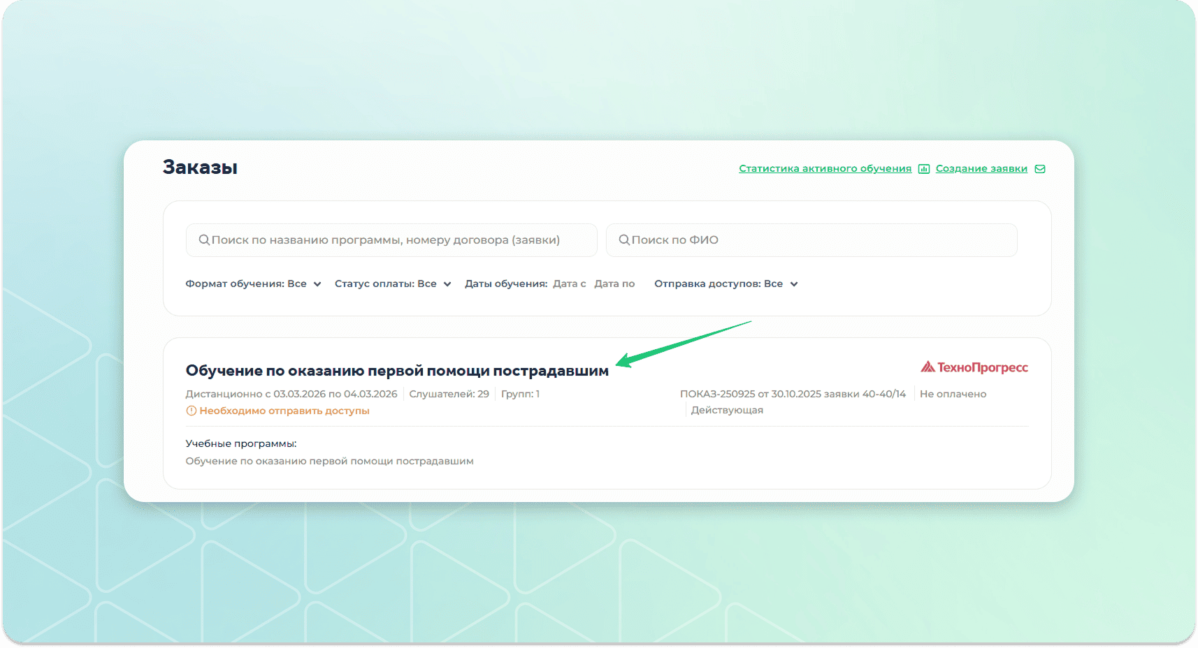Перейти в раздел "Обучение в УЦ" - "Заказы".
