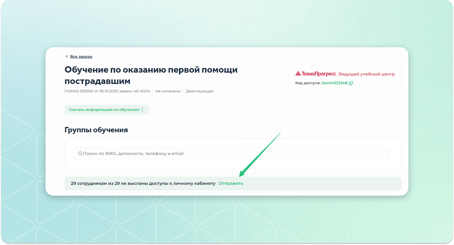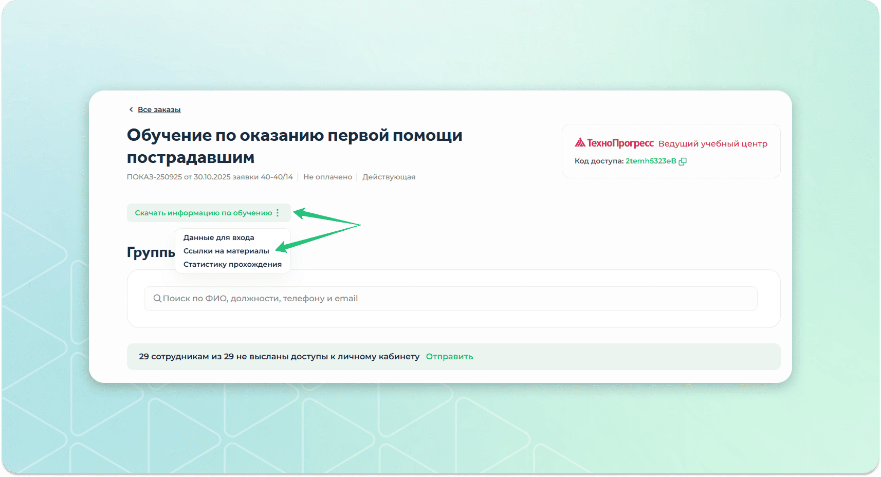 Отправка сотрудникам доступов, статистика обучения, сканы документов