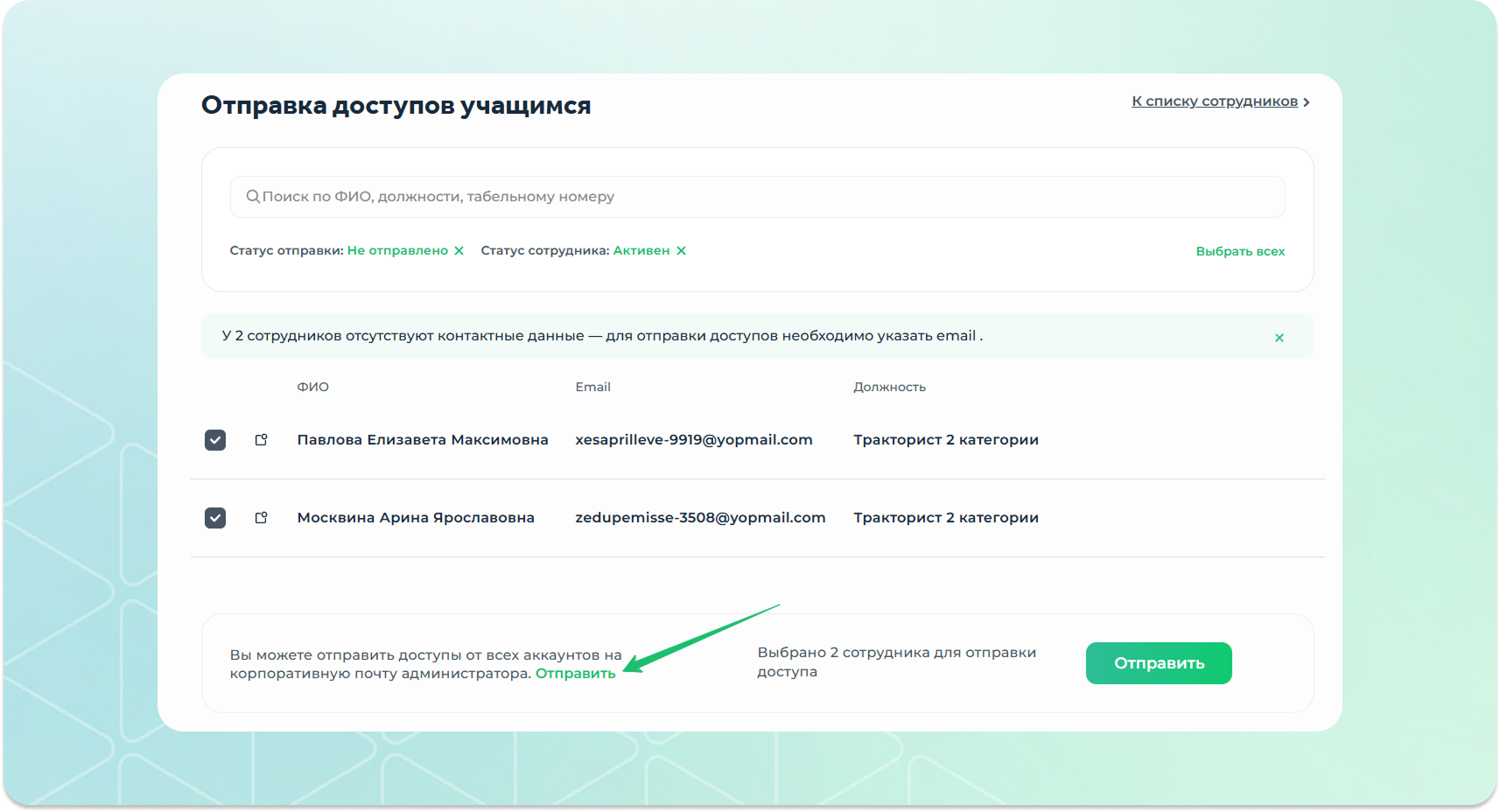 направить доступы к личным кабинетам сотрудников на одну почту администратора