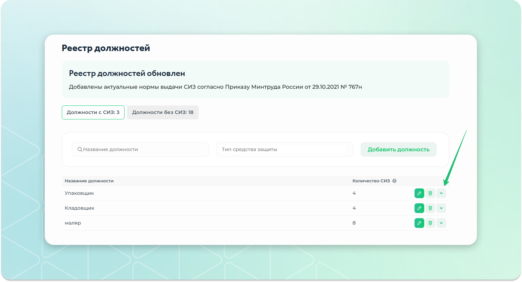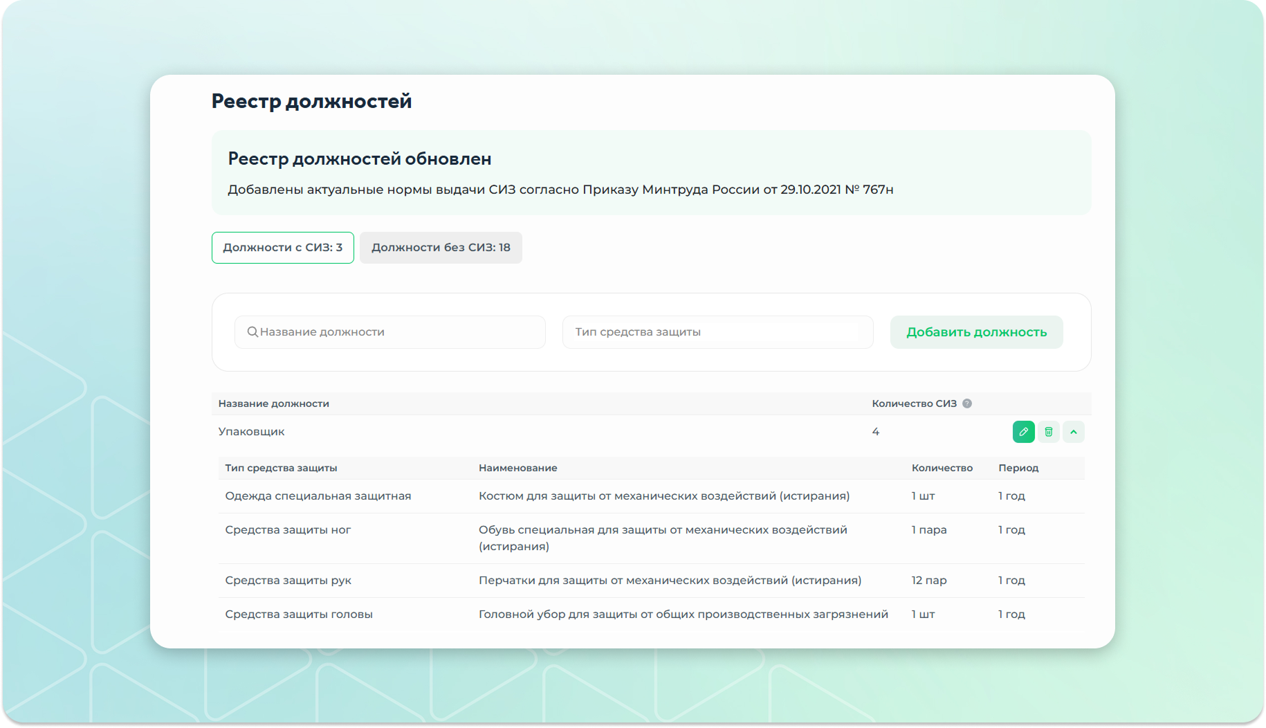 Если должность присутствует в реестре Минтруда, для неё автоматически отобразится набор необходимых средств индивидуальной защиты.