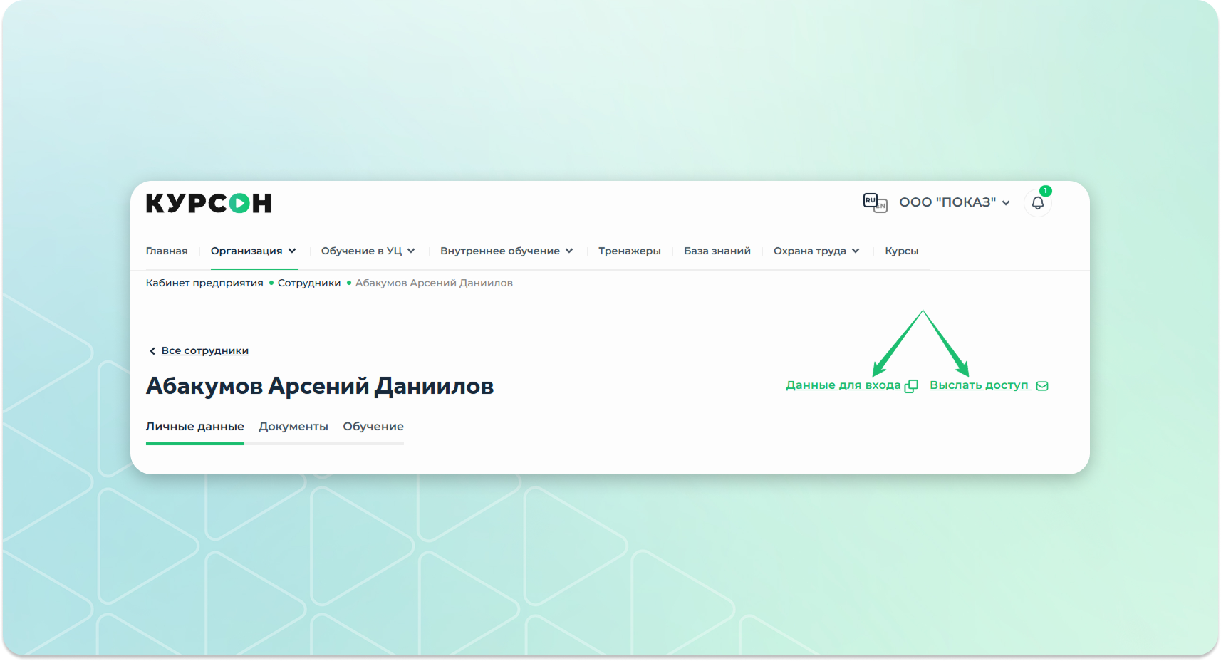 Нажать на кнопку “Выслать доступ” или “Данные для входа” (если требуется отправить доступ сотруднику вручную).