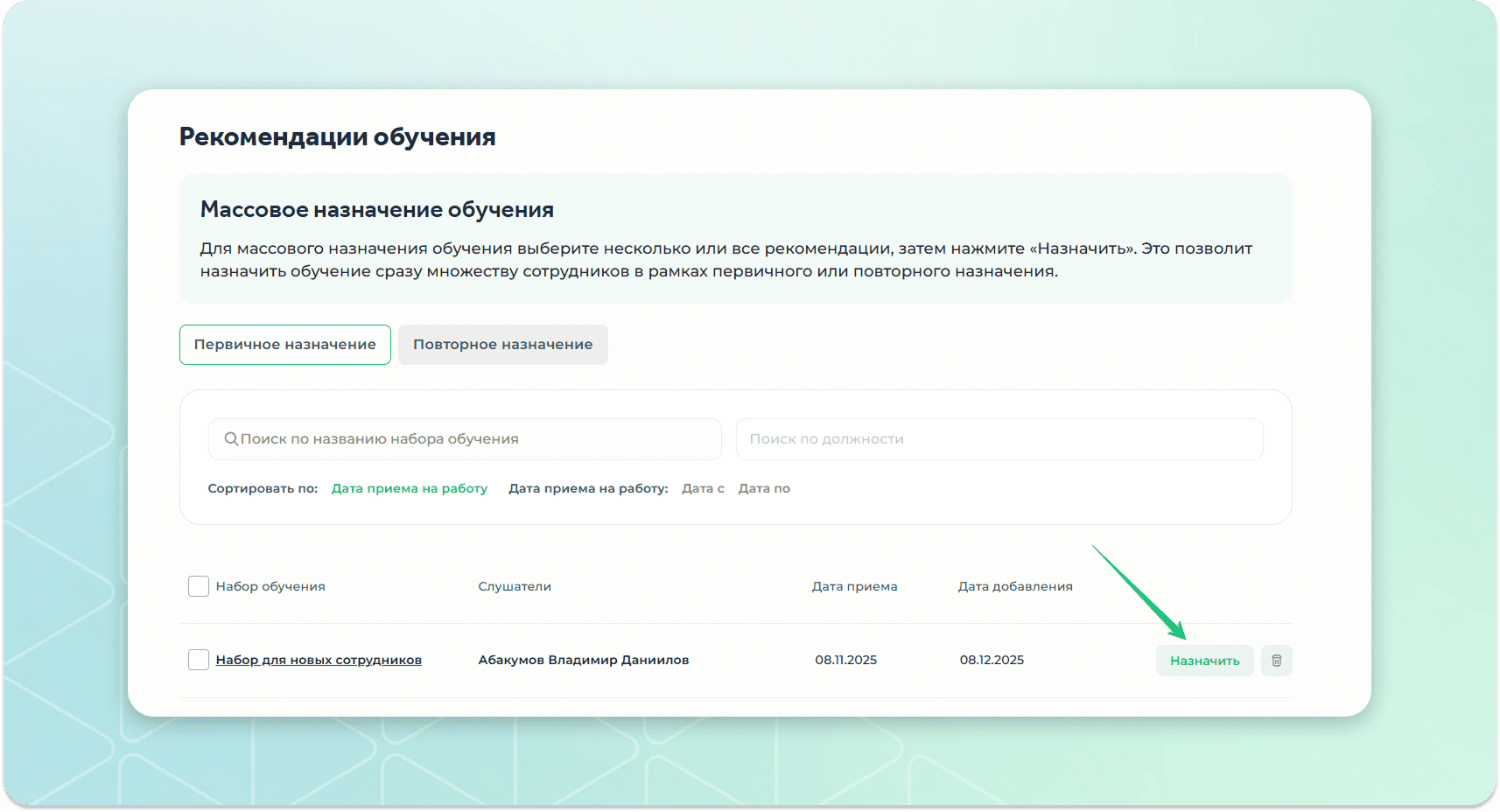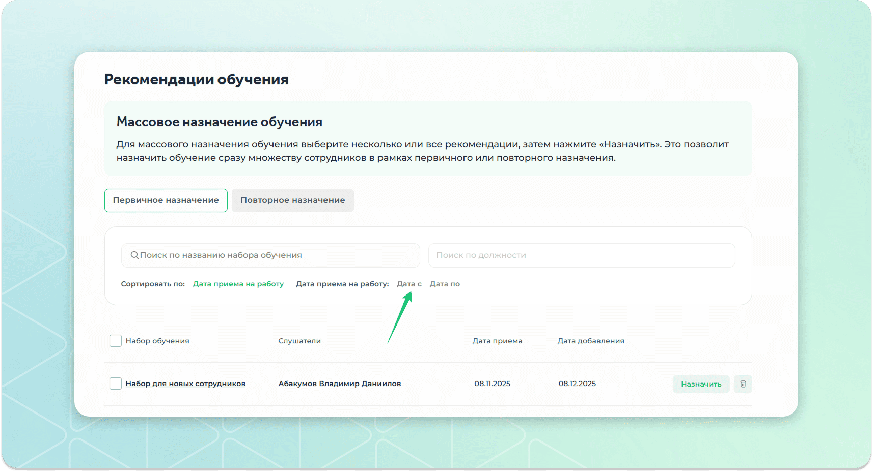 В рекомендациях первичного обучения по умолчанию появляются только сотрудники, у которых не более 5 дней с даты устройства.