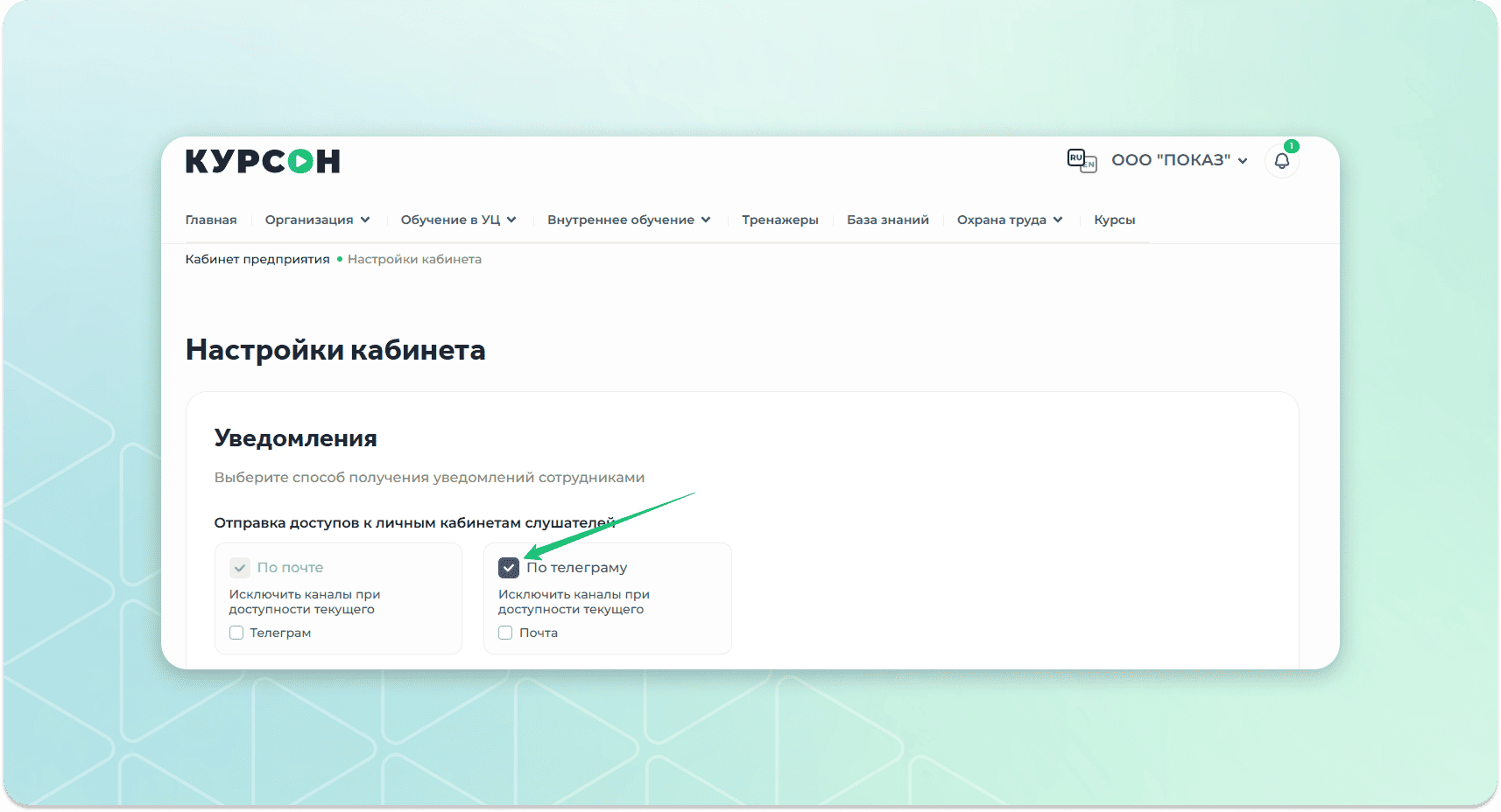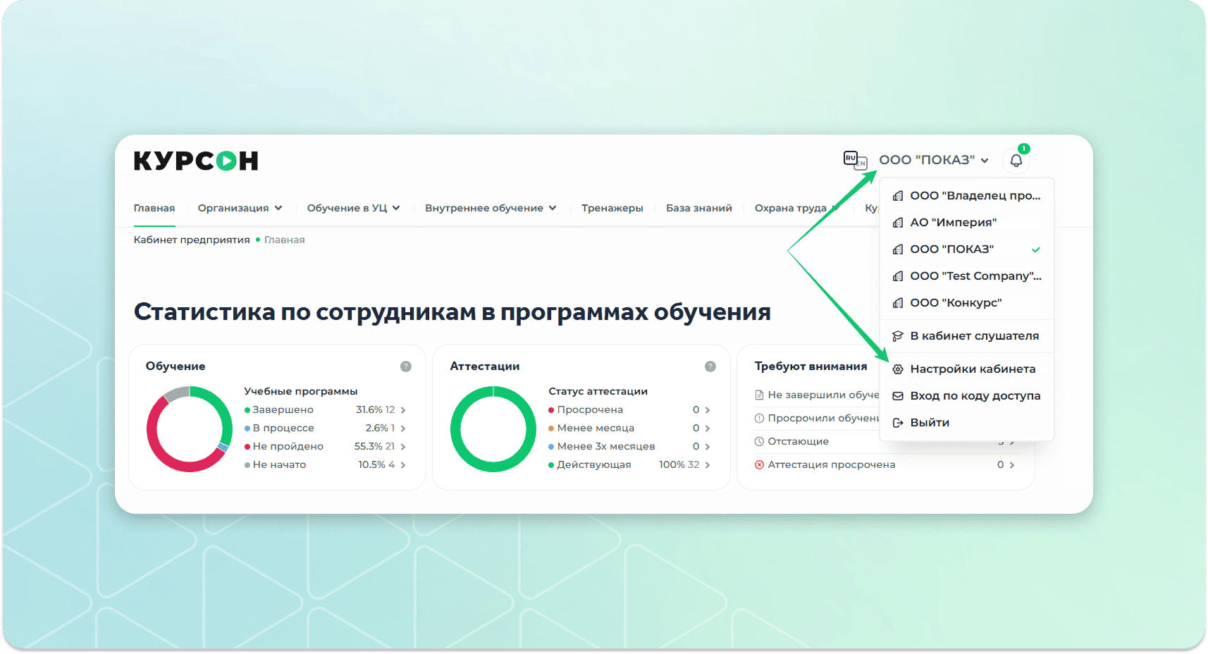 Нажать на название организации, далее перейти в раздел "Настройки кабинета".