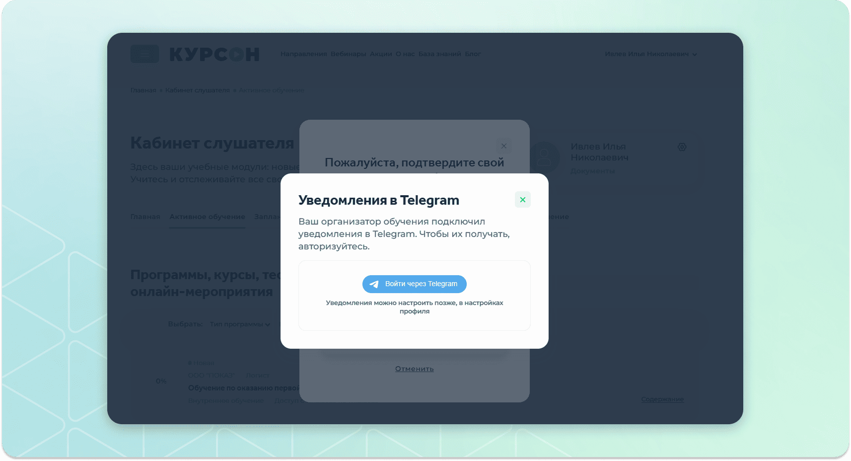 При первом входе данные для авторизации направляются на электронную почту или лично организатором обучения. После первичной авторизации в личном кабинете слушателя становится доступна опция привязки профиля в Telegram. После успешной привязки профиля, последующие данные для входа в личный кабинет будут направляться через Telegram.