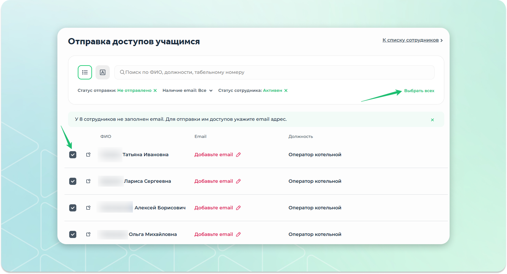 Выбрать сотрудников и нажать на кнопку "Отправить"