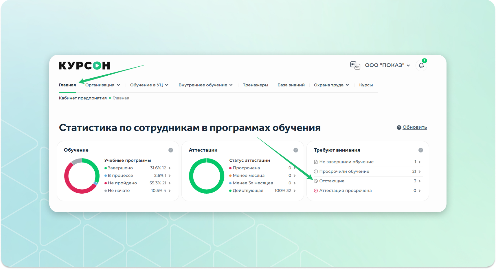 Перейти в подраздел "Отстающие" можно через раздел "Главная" и раздел "Организация"