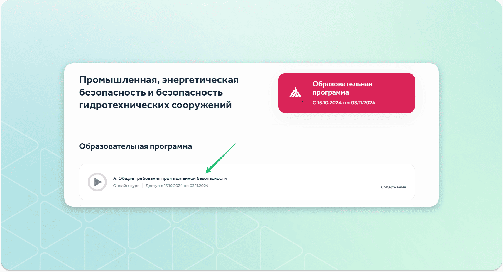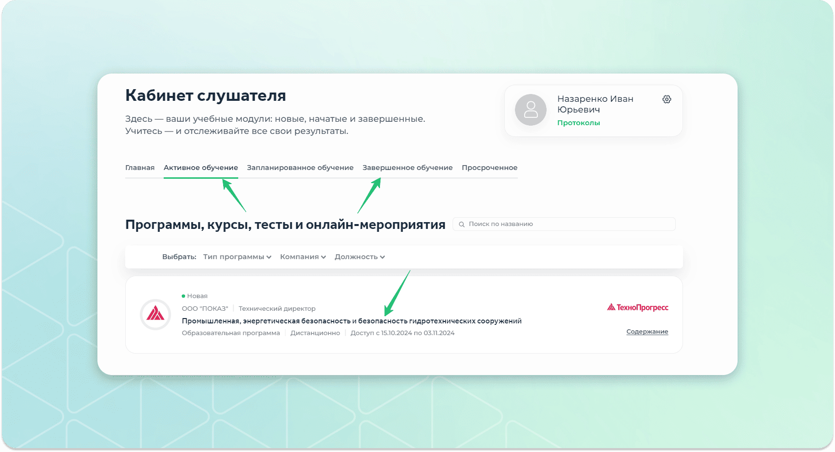 Чтобы ознакомиться с программой обучения, необходимо перейти в раздел «Активное обучение» или «Завершенное обучение» (если курс пройден на 100 %) и нажать на название программы.